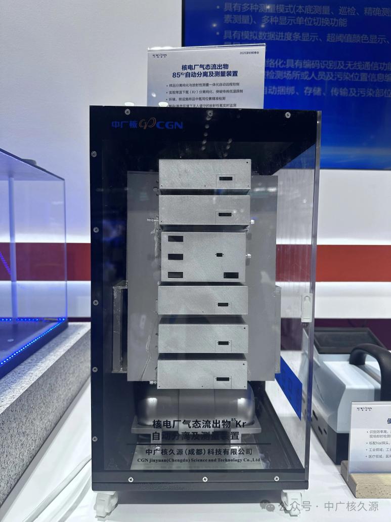 大會同期舉辦的深圳國際核能產業創新博覽會匯聚了來自全球的600多家核電產業鏈企業,參展面積達6萬平方米,集中呈現5萬余項前沿技術成果,全方位展現核能產業的創新活力與發展潛力。中廣核久源公司攜重點產品亮相展館,包括核電廠氣態流出物85Kr自動分離及測量裝置、空間立體應急輻射監測系統等,充分展現了其在核測控裝備研發制造領域的專業實力與行業擔當。